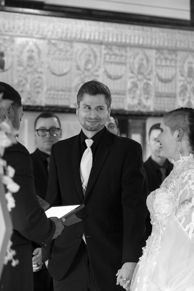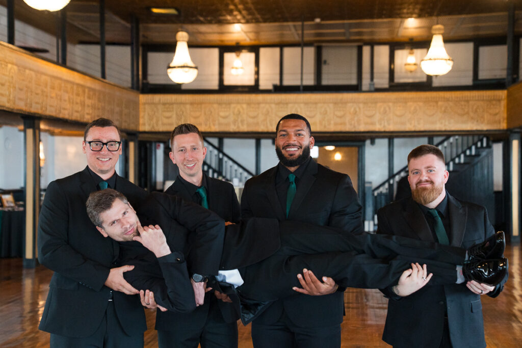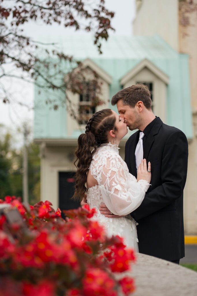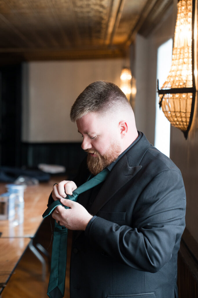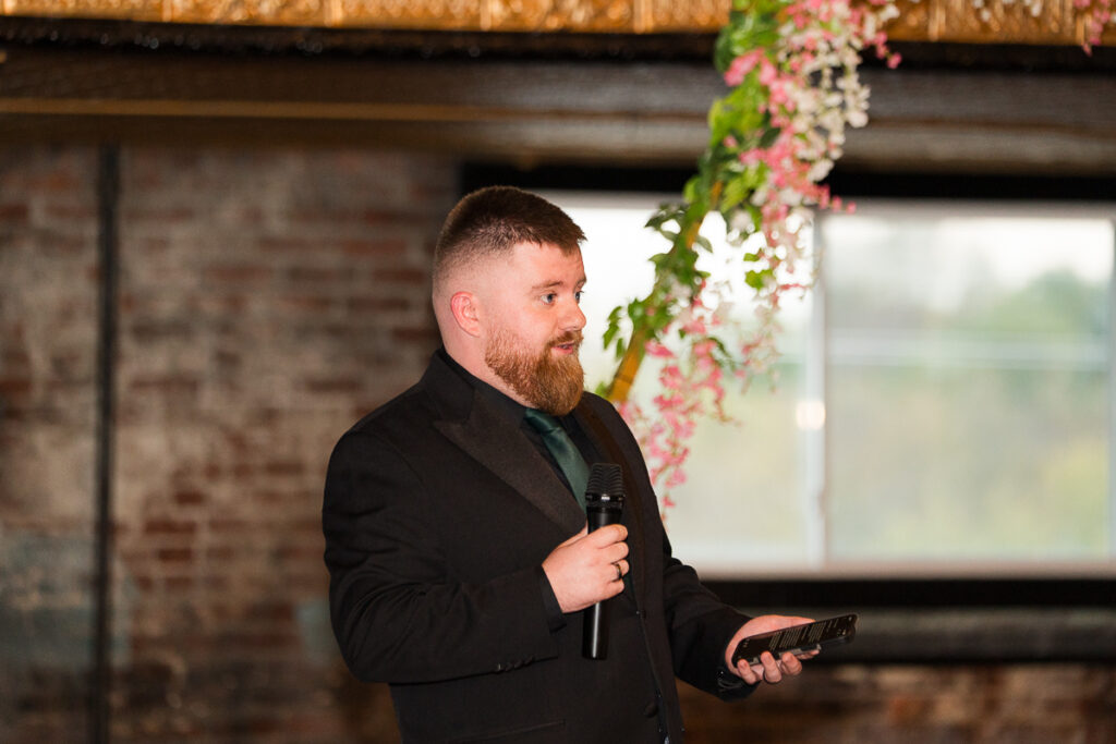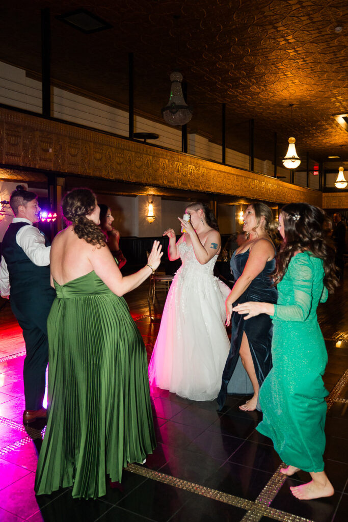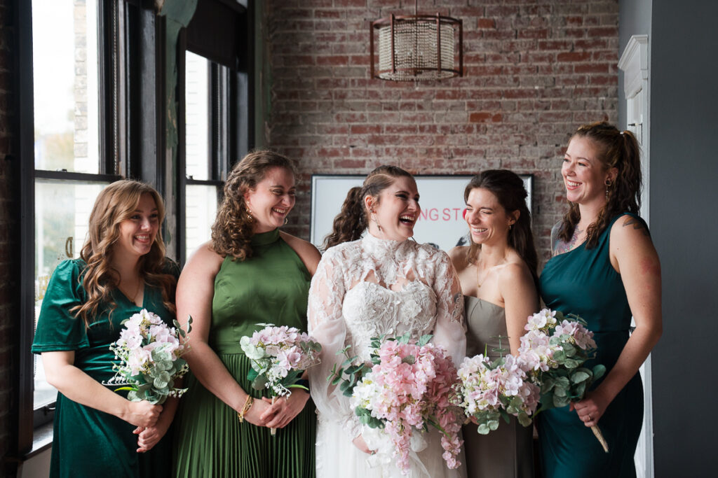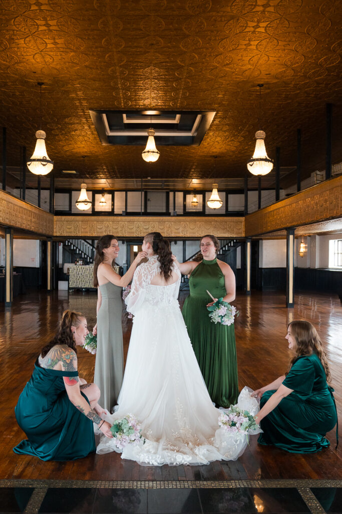 As I arrived at the venue, trick or treaters were mingling on the streets. The fall vibes were at peak level, like something out of a Hallmark movie. The day started as both bride and groom got ready with their bridal party. Julia’s bridesmaid’s hyped her up as she got dressed in a gorgeous corseted gown. Emerson gave his groomsmen customized Funko pops, a fun gift to thank them for the support!