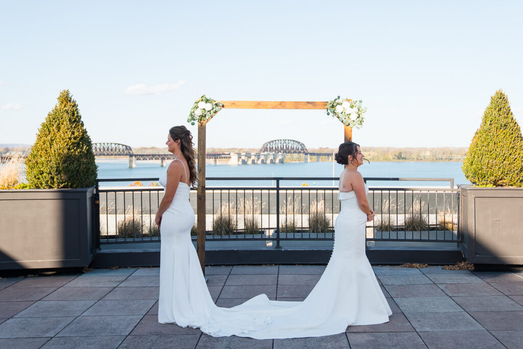 The day started getting ready at The Galt House Hotel. Energy was high as both brides got glammed up surrounded by their bridal parties. After traveling to Frazier, the couple shared a private first look on the rooftop. It allowed them to breathe, connect, and savor the start of their day. That quiet moment brought genuine emotion and set the tone for the celebration.