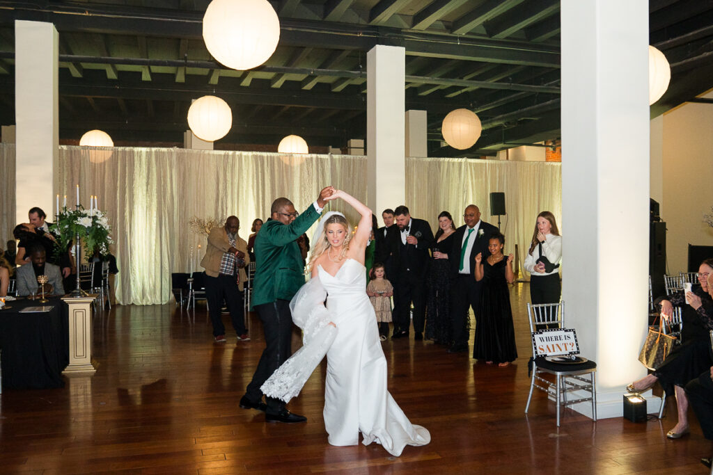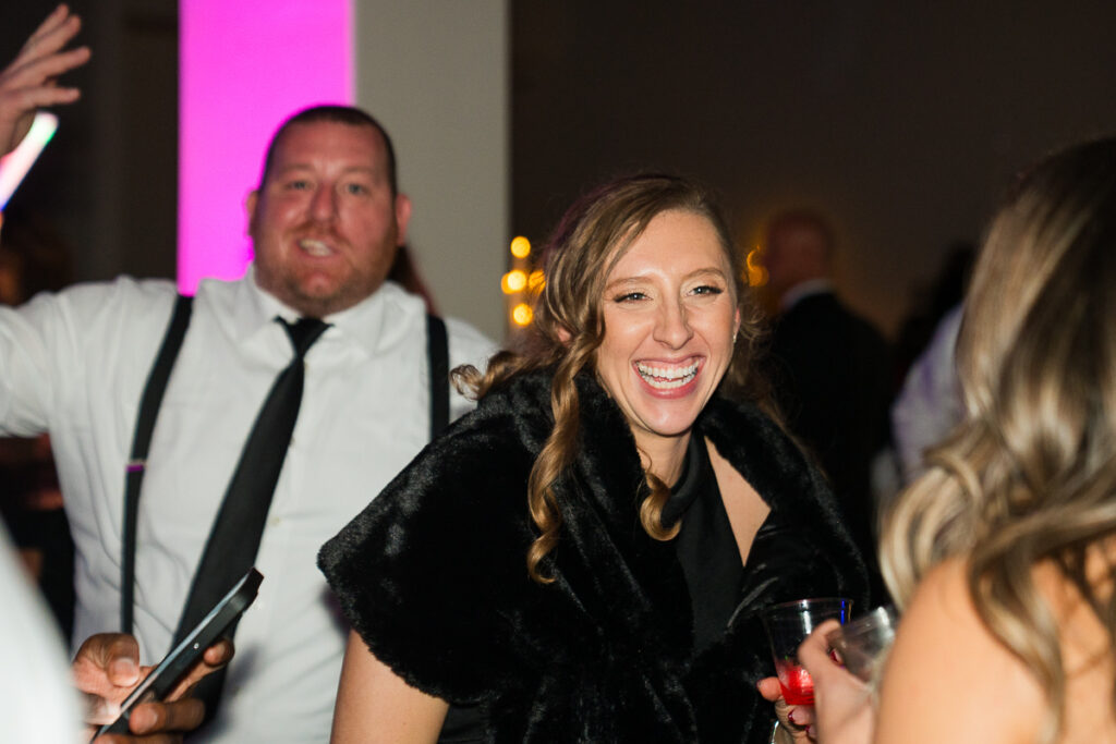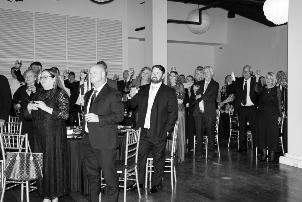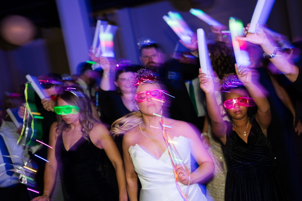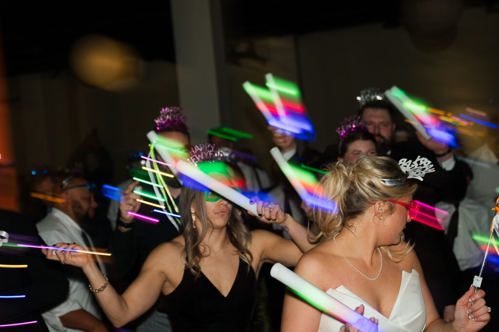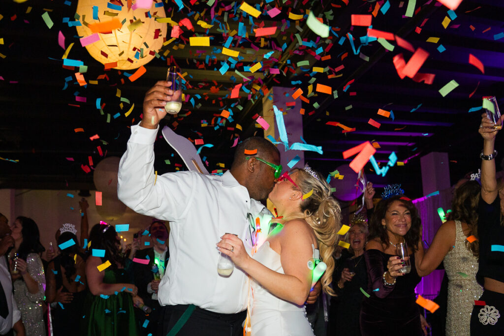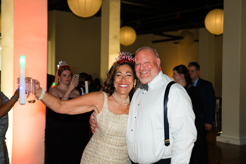As evening arrived, the wedding transformed into the ultimate New Year’s Eve party. Guests filled the dance floor with nonstop energy. Every detail felt intentional, from the elegant décor to the playful nods to the holiday.