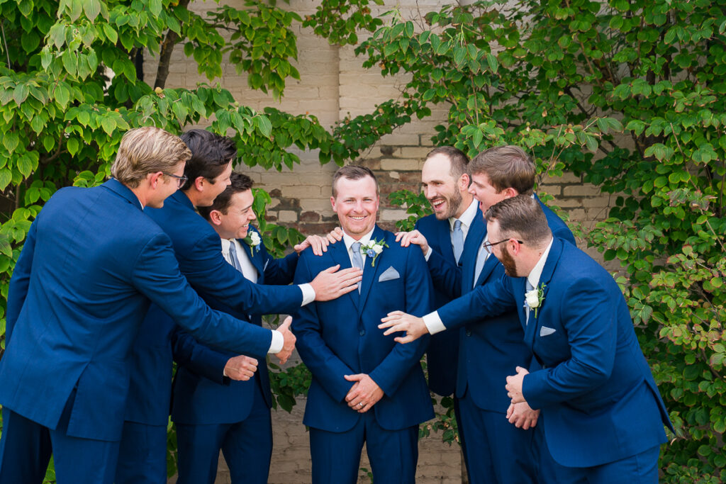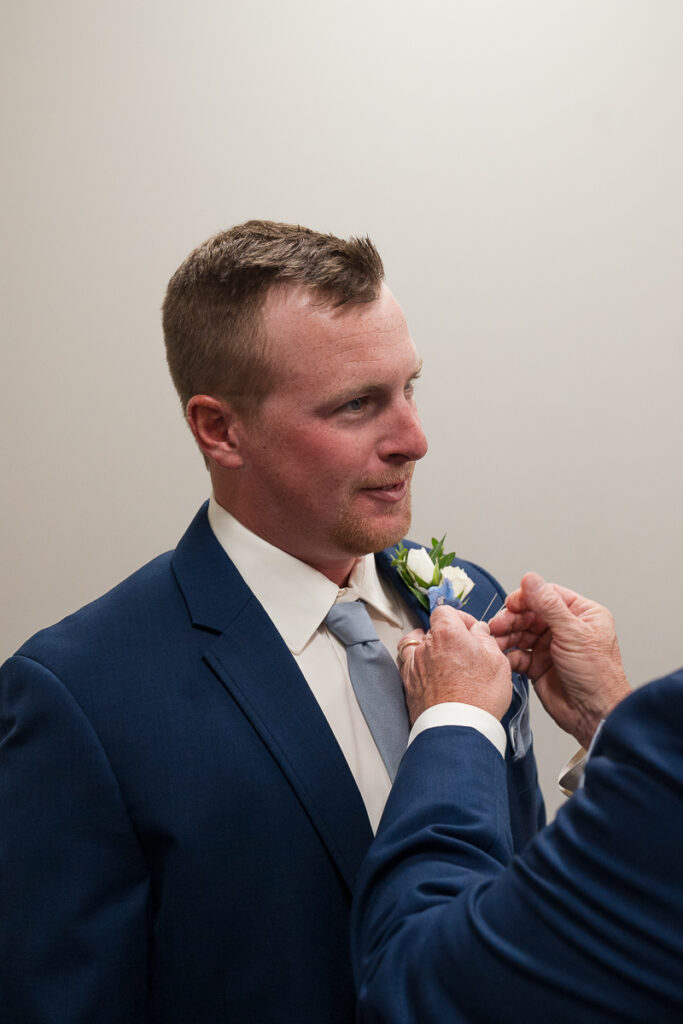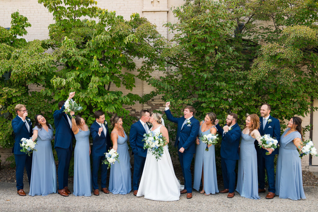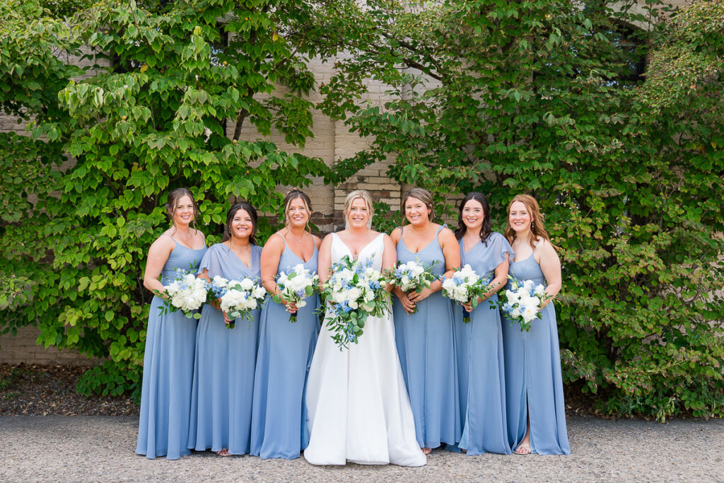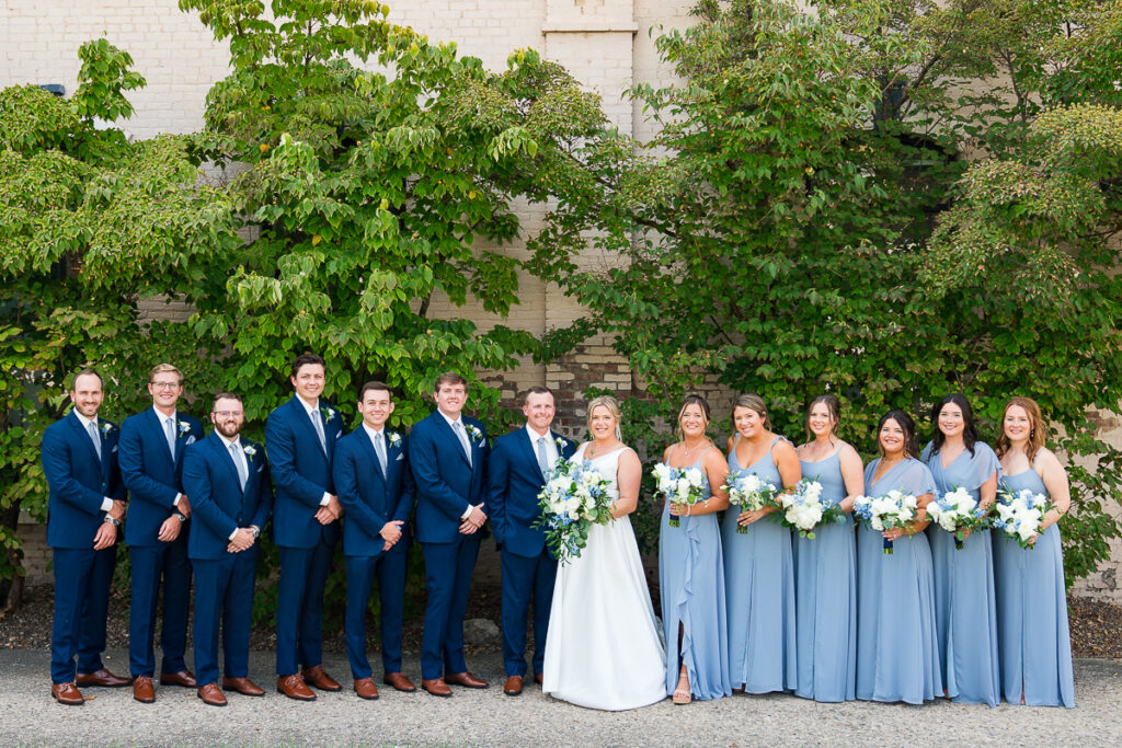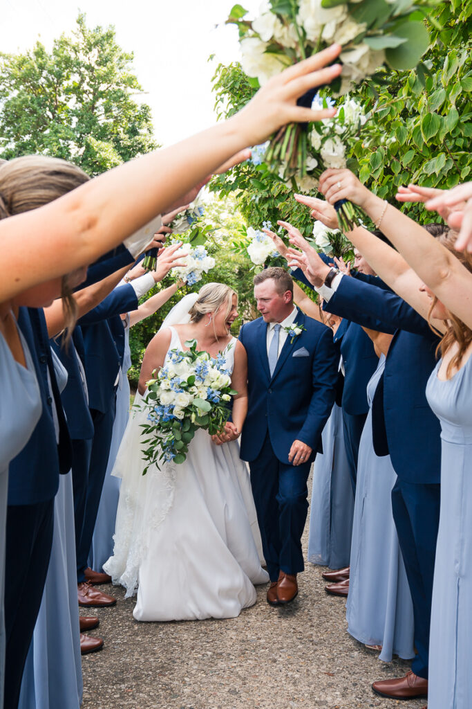 The couple chose a light blue and navy color scheme with gold and ivory accents. Ashley looked absolutely stunning in her satin gown. Tyler looked equally handsome in a navy blue suit. After a fun morning of getting ready and a heartfelt first look, we spent some time taking photos around the venue.