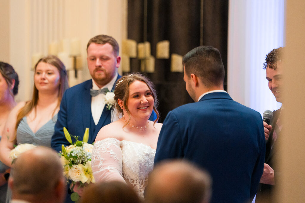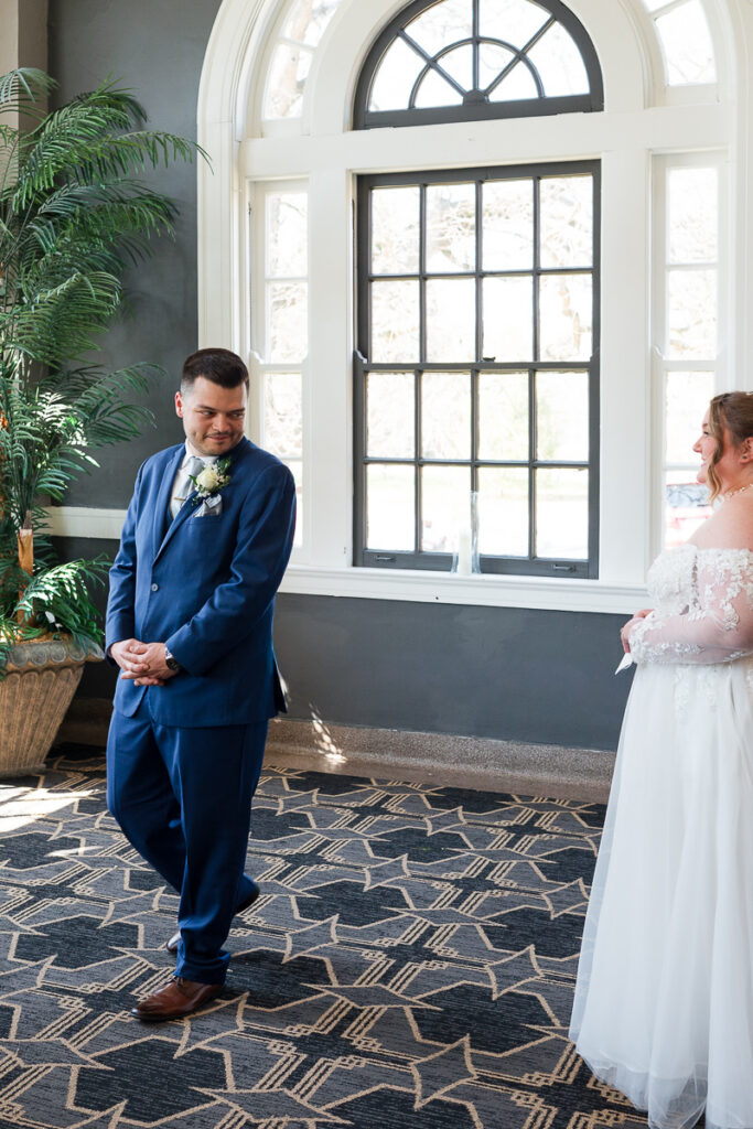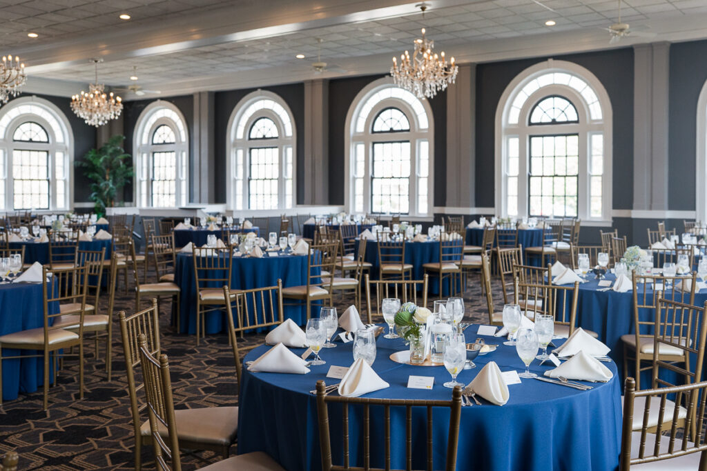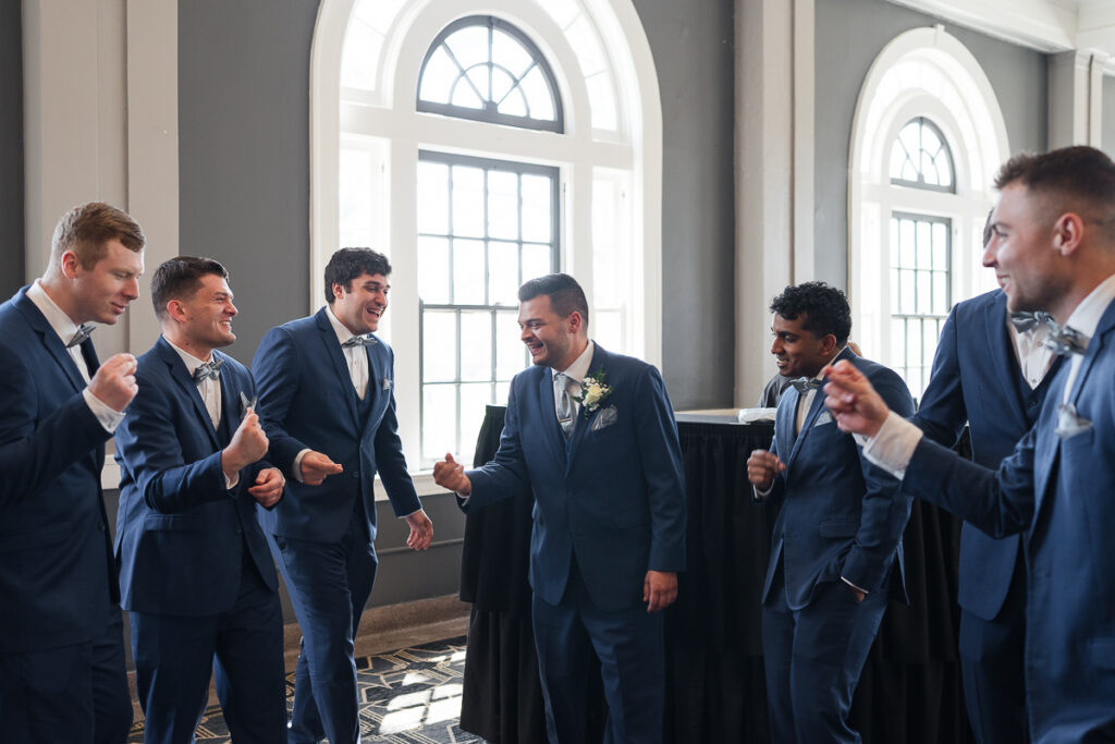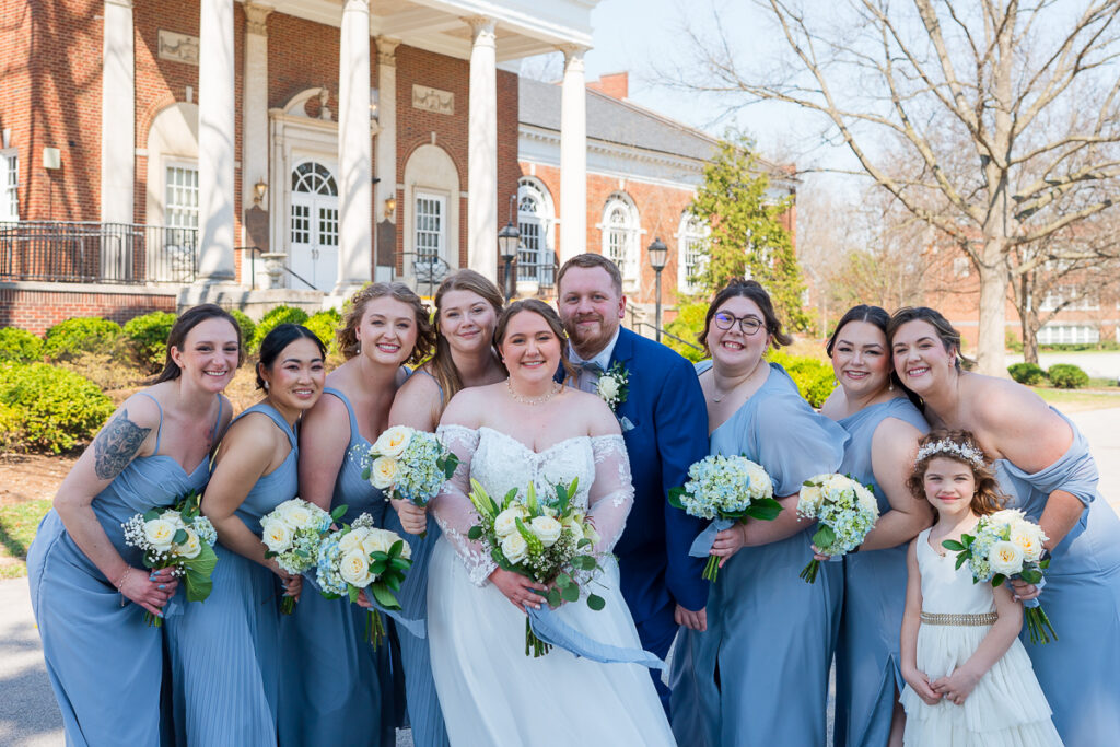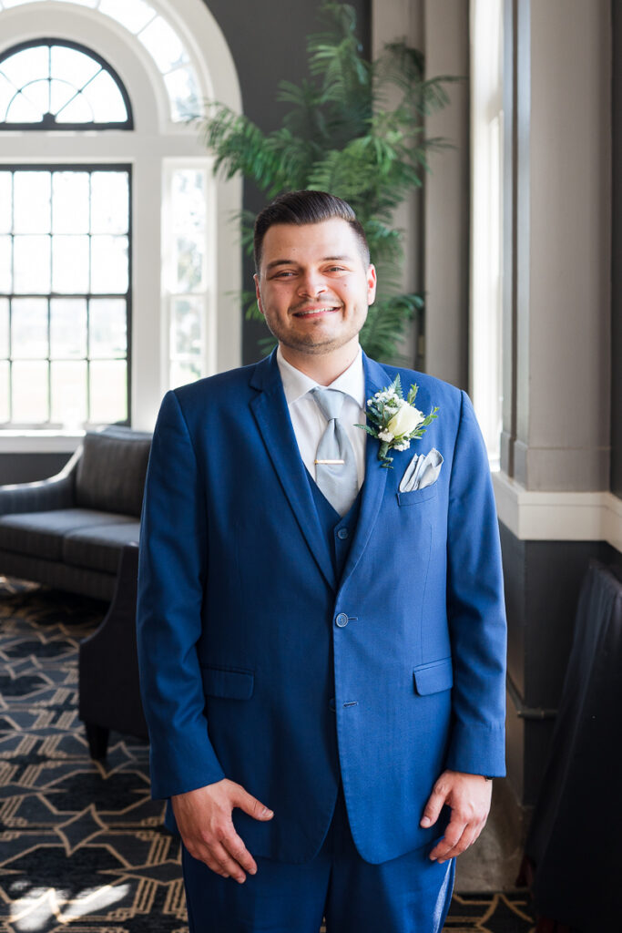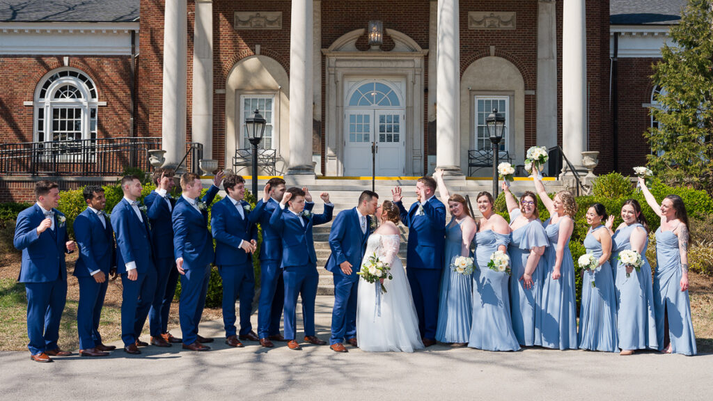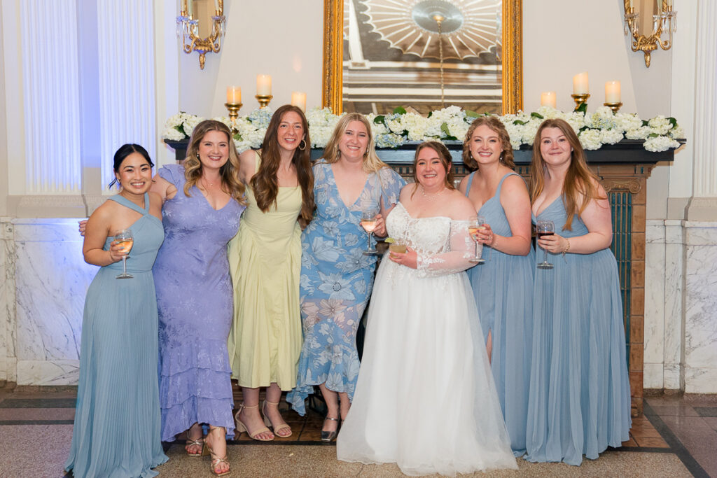 As always, The Olmsted was a perfect backdrop for a wedding. Natural light poured through the windows all day. As a result, every moment felt airy and bright. Caitlin wore a beautiful gown with lace sleeves and subtle sparkle. Meanwhile, Phil looked handsome in a classic navy tux. The bridal party supported in shades of blue.